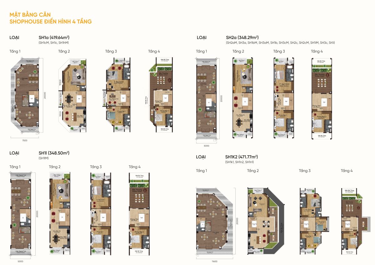 – Shophouse 4 tầng: diện tích sàn ~275–444 m²