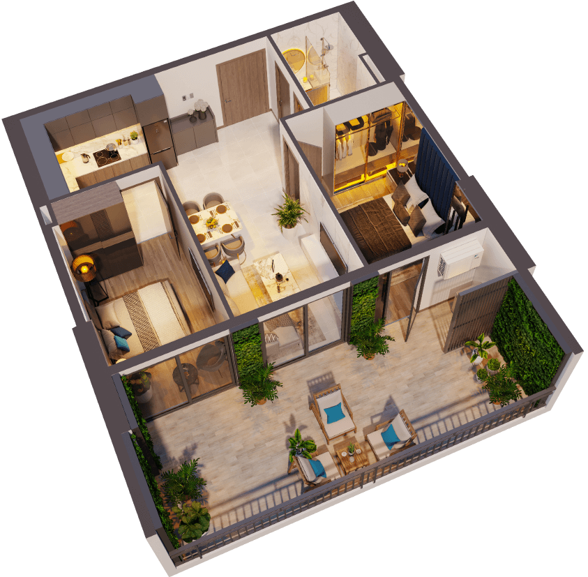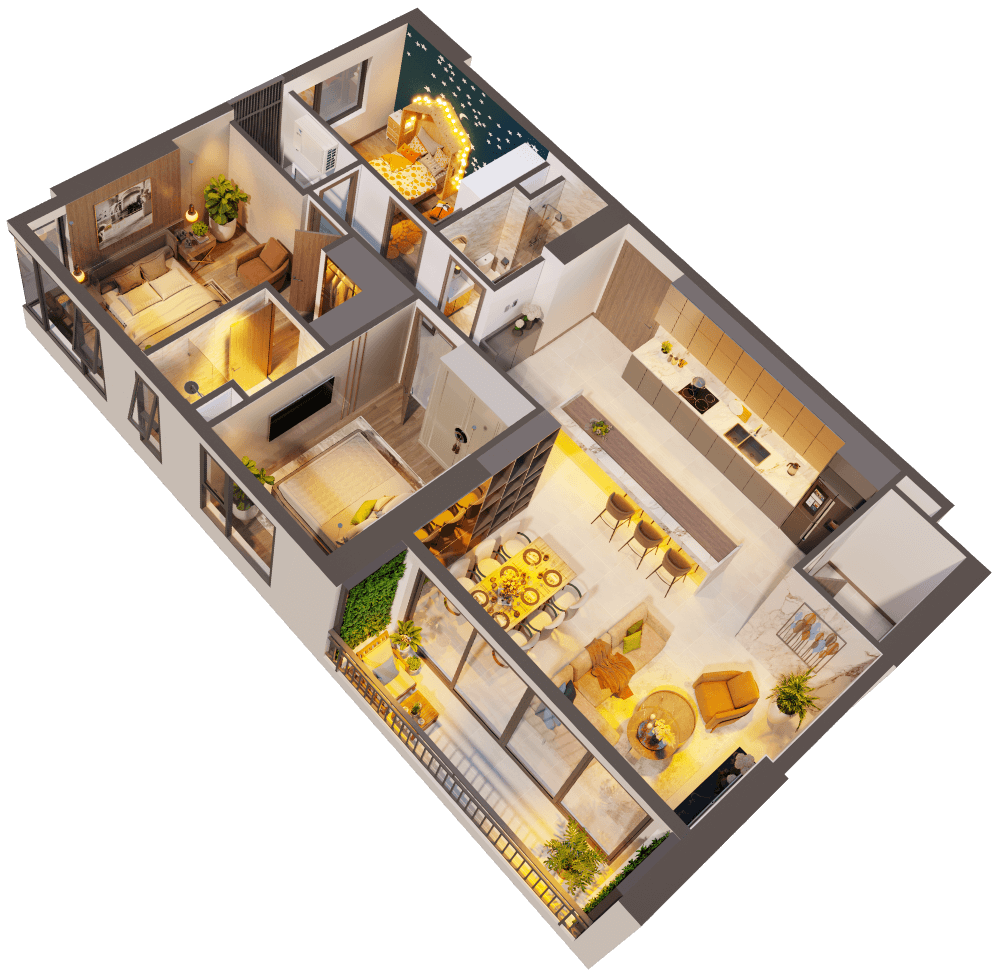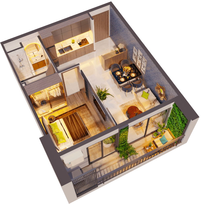 • 1 Phòng Ngủ – 1WC: 48–53m² – giá từ 1.99 tỷ • 2 Phòng Ngủ – 2WC: 65–74m² • 2PN + 1: 77–85m² • 3 Phòng Ngủ – 2WC: 96–108m²